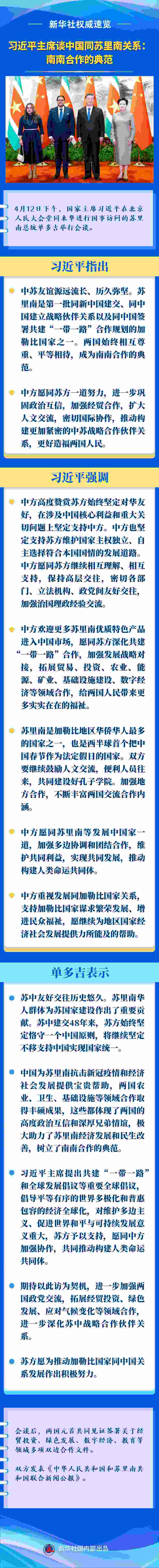 習(xí)近平主席談中國(guó)同蘇里南關(guān)系:南南合作的典范 4月12日下午,國(guó)家主席習(xí)近平在北京人民大會(huì)堂同來(lái)華進(jìn)......
