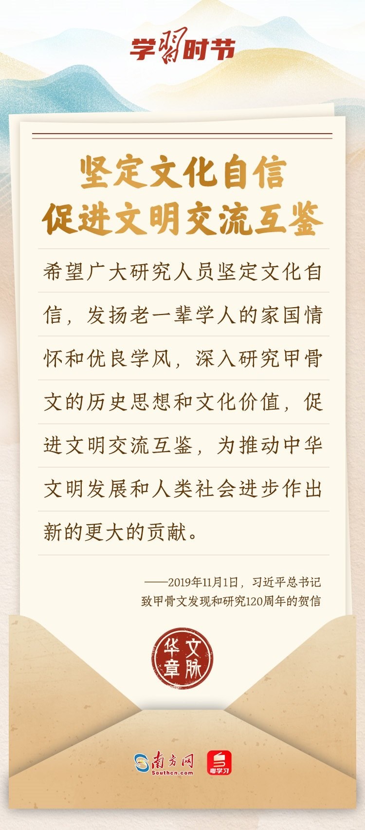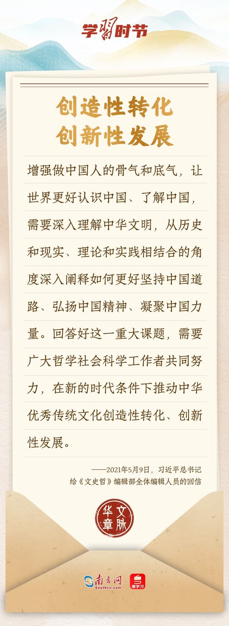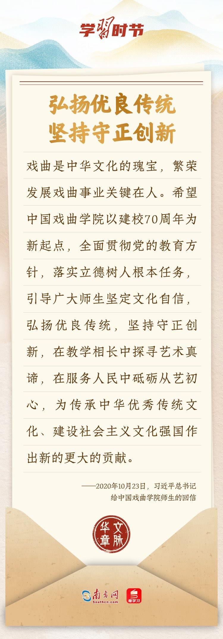 “中華民族在幾千年歷史中創(chuàng)造和延續(xù)的中華優(yōu)秀傳統(tǒng)文化,是中華民族的根和魂。”習(xí)近平總書記多次通過發(fā)賀信、寫回信等方式,表達(dá)著對弘揚中華優(yōu)秀傳統(tǒng)文化的殷切希望,飽含深情、字字暖心、催人奮進。讓我們一起“讀”信。