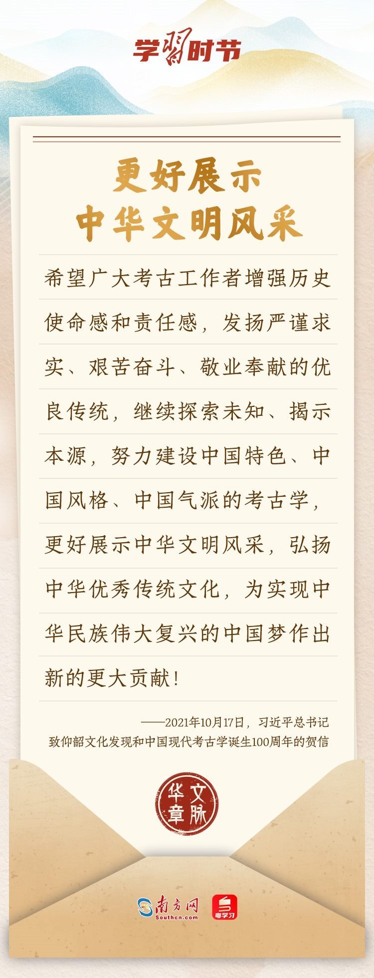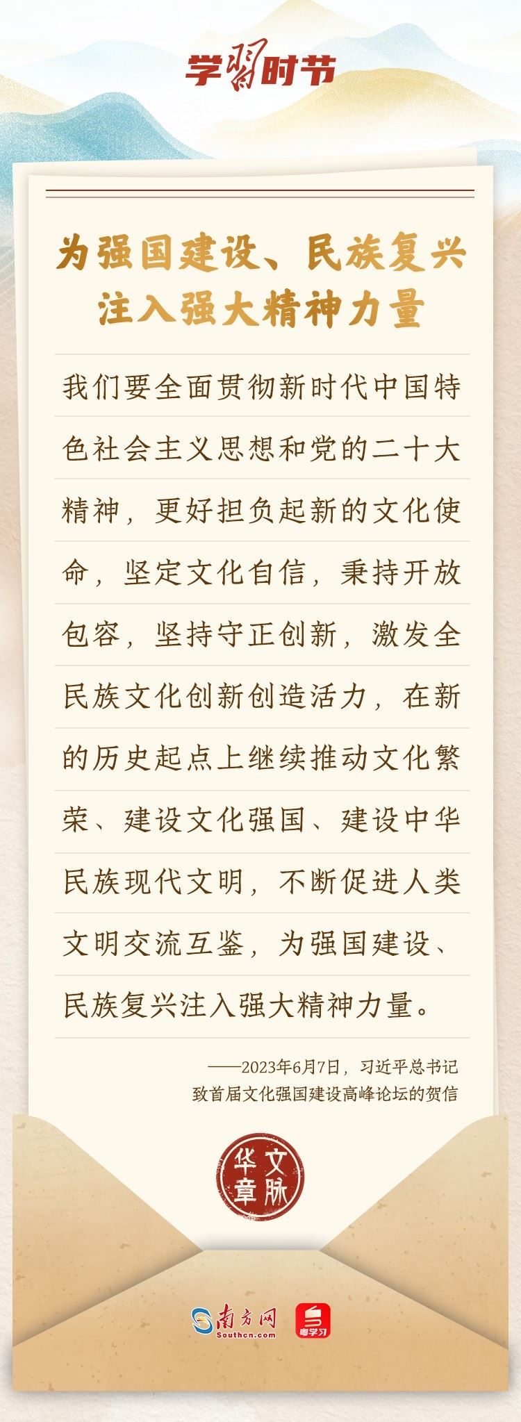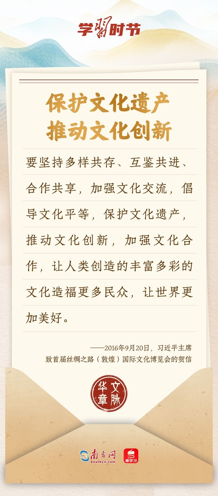 “中華民族在幾千年歷史中創(chuàng)造和延續(xù)的中華優(yōu)秀傳統(tǒng)文化,是中華民族的根和魂。”習(xí)近平總書記多次通過發(fā)賀信、寫回信等方式,表達(dá)著對弘揚中華優(yōu)秀傳統(tǒng)文化的殷切希望,飽含深情、字字暖心、催人奮進。讓我們一起“讀”信。