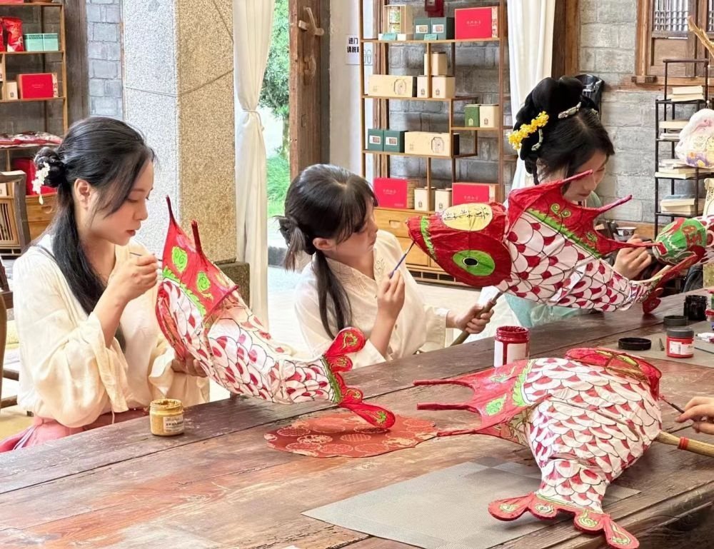 游客在西溪南村體驗(yàn)制作魚燈。(受訪者供圖)