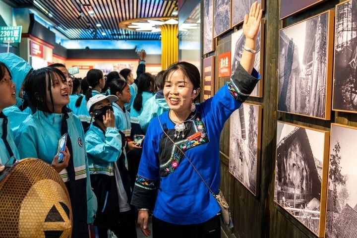 在湖南湘西十八洞村,講解員施艷琴為游客講解十八洞村的故事(2023年11月1日攝)。新華社記者 陳思汗 攝