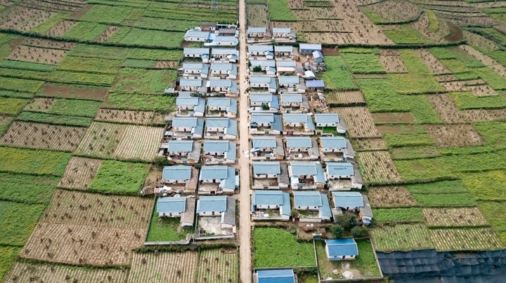 俯瞰四川省昭覺(jué)縣地莫鄉(xiāng)地莫村田園中的新居(2020年10月10日攝,無(wú)人機(jī)照片)。新華社記者 張笑宇 攝