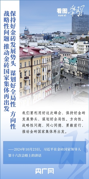 當?shù)貢r間10月23日,國家主席習近平在俄羅斯喀山出席金磚國家領導人第十六次會晤并發(fā)表重要講話。習主席深刻闡述推動“大金磚合作”高質(zhì)量發(fā)展的中國主張,就金磚大家庭發(fā)展合作提出五點務實舉措,表達了中方愿同金磚各國一道,攜手更多“全球南方”國家共同推動構建人類命運共同體的真誠愿望。一起來學習!