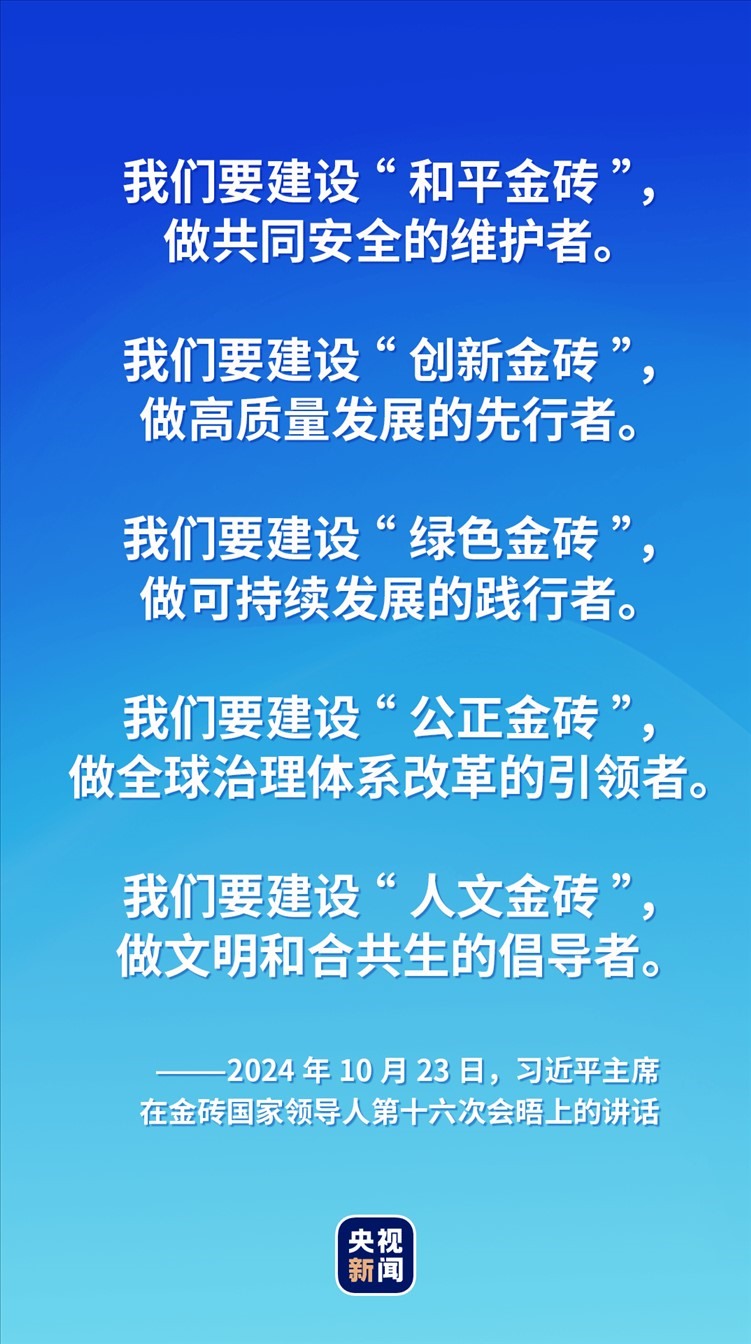 對(duì)于如何推動(dòng)“大金磚合作”高質(zhì)量發(fā)展,習(xí)近平主席提出五點(diǎn)建議——建設(shè)“和平金磚”“創(chuàng)新金磚”“綠色金磚”“公正金磚”“人文金磚”,攜手更多“全球南方”國家共同推動(dòng)構(gòu)建人類命運(yùn)共同體。