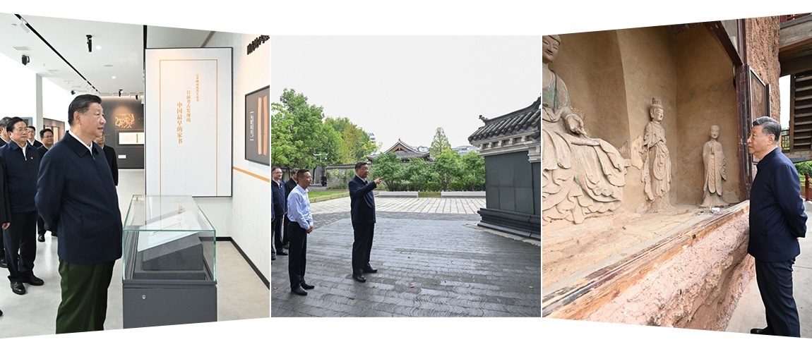 △ 自左向右分別為:2024年11月4日,習(xí)近平總書記在湖北孝感云夢(mèng)縣博物館參觀出土秦漢簡牘展;2024年10月17日,習(xí)近平總書記在安徽桐城六尺巷考察;2024年9月11日,習(xí)近平總書記在甘肅天水麥積山石窟考察。