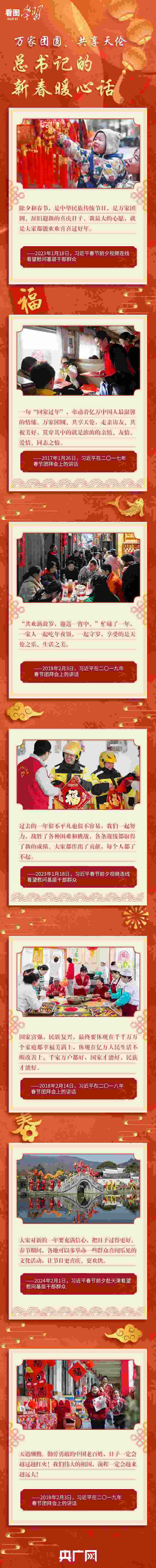 “共歡新故歲,迎送一宵中?!弊鳛橹腥A民族的傳統(tǒng)節(jié)日,除夕和春節(jié)是萬家團圓、辭舊迎新最重要的日子。每年春節(jié)前夕,習近平總書記都要看望慰問各地基層干部群眾,向全國各族人民送上新春祝福。