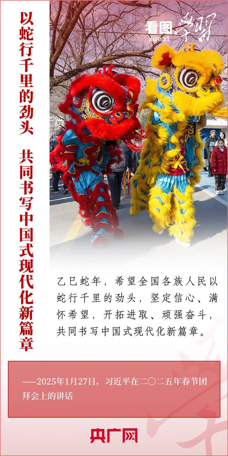 1月27日,中共中央、國(guó)務(wù)院在北京舉行春節(jié)團(tuán)拜會(huì),習(xí)近平總書記發(fā)表熱情洋溢的講話,向全國(guó)各族人民、港澳臺(tái)同胞、海外僑胞拜年并致以新春祝福。總書記在講話中深情回顧過去一年中國(guó)式現(xiàn)代化取得很不平凡的發(fā)展歷程,“希望全國(guó)各族人民以蛇行千里的勁頭,堅(jiān)定信心、滿懷希望,開拓進(jìn)取、頑強(qiáng)奮斗,共同書寫中國(guó)式現(xiàn)代化新篇章。”一起來學(xué)習(xí)!