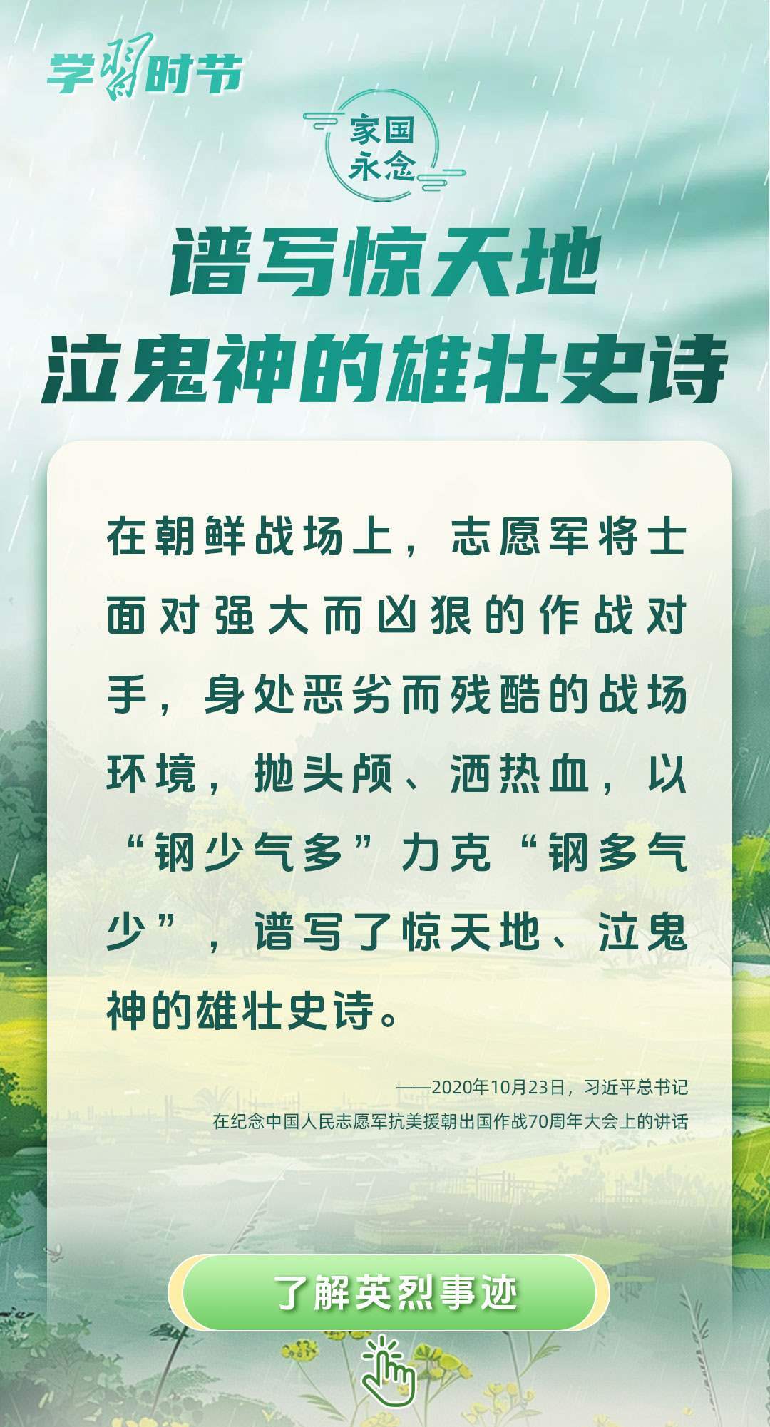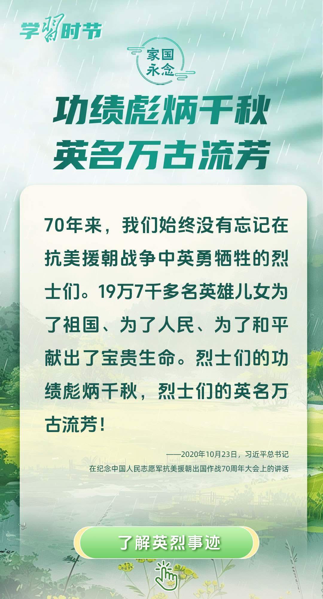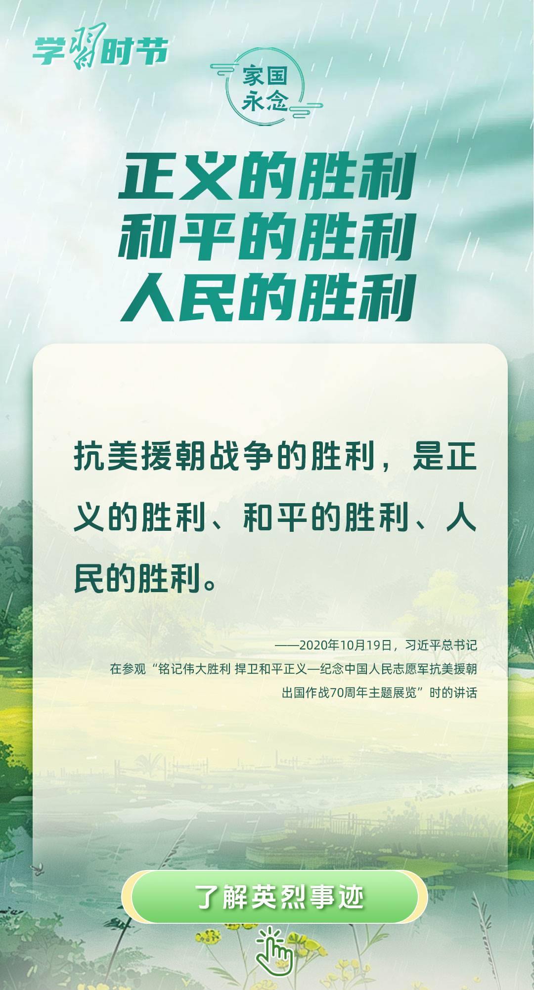 今年是中國人民抗日戰(zhàn)爭暨世界反法西斯戰(zhàn)爭勝利80周年、中國人民志愿軍抗美援朝出國作戰(zhàn)75周年。習近平總書記曾說:“對一切為國家、為民族、為和平付出寶貴生命的人們,不管時代怎樣變化,我們都要永遠銘記他們的犧牲和奉獻?!苯裉煳覀兯鶕碛械囊磺?,無不凝結著英雄、英烈們的奉獻付出乃至巨大犧牲。