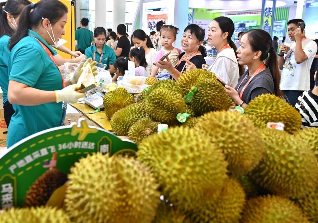 2024年9月28日,觀眾在中國-東盟博覽會上挑選馬來西亞榴蓮。新華社記者周華攝