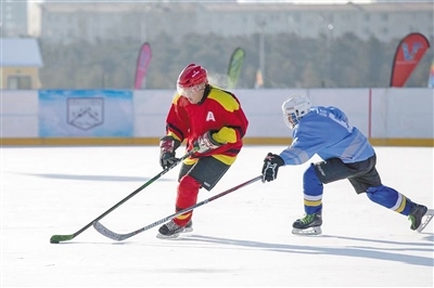 在呼和浩特市一冰場內(nèi),球員在冰球比賽中拼搶。記者 于濤 攝