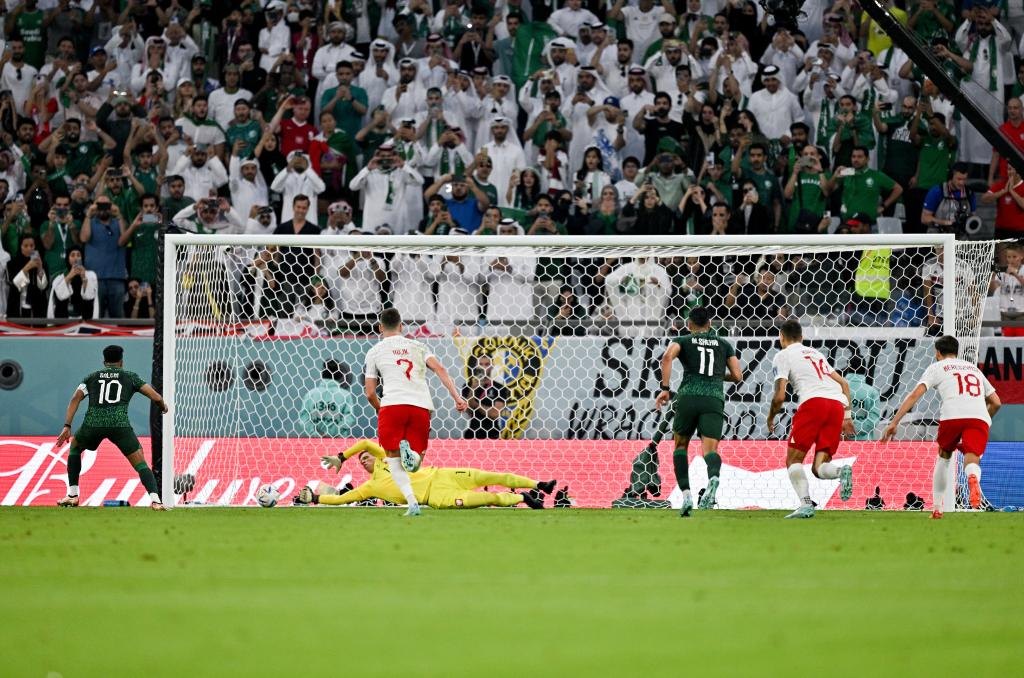 11月26日,沙特阿拉伯隊球員薩勒姆-達(dá)瓦薩里(左一)罰點球被波蘭隊守門員什琴斯尼撲出。新華社記者 辛悅衛(wèi) 攝