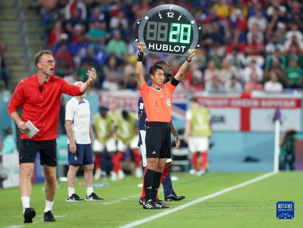 2022年11月26日,第四官員馬寧(右)在卡塔爾世界杯法國(guó)隊(duì)對(duì)丹麥隊(duì)的比賽中舉起換人牌。新華社記者 李明 攝
