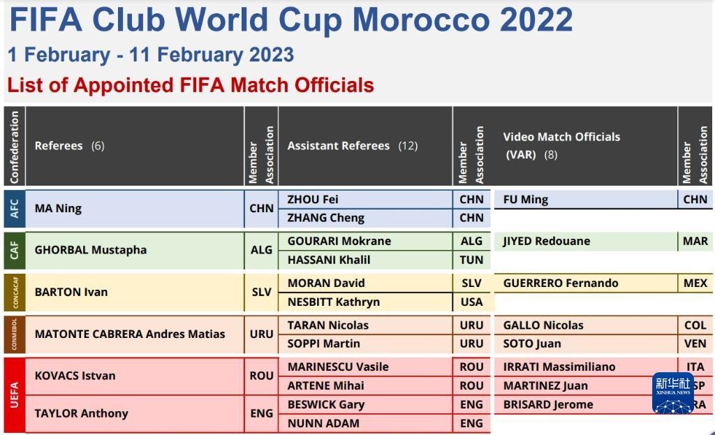 新華社北京1月15日電 國(guó)際足聯(lián)15日在官網(wǎng)公布2022摩洛哥世俱杯執(zhí)法裁判員名單,國(guó)際級(jí)裁判員馬寧、傅明和國(guó)際級(jí)助理裁判員周飛、張鋮入選。這將是中國(guó)裁判員首次執(zhí)法該項(xiàng)國(guó)際足聯(lián)頂級(jí)賽事。