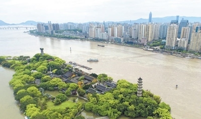 朔門古港與江心嶼航標塔俯拍。