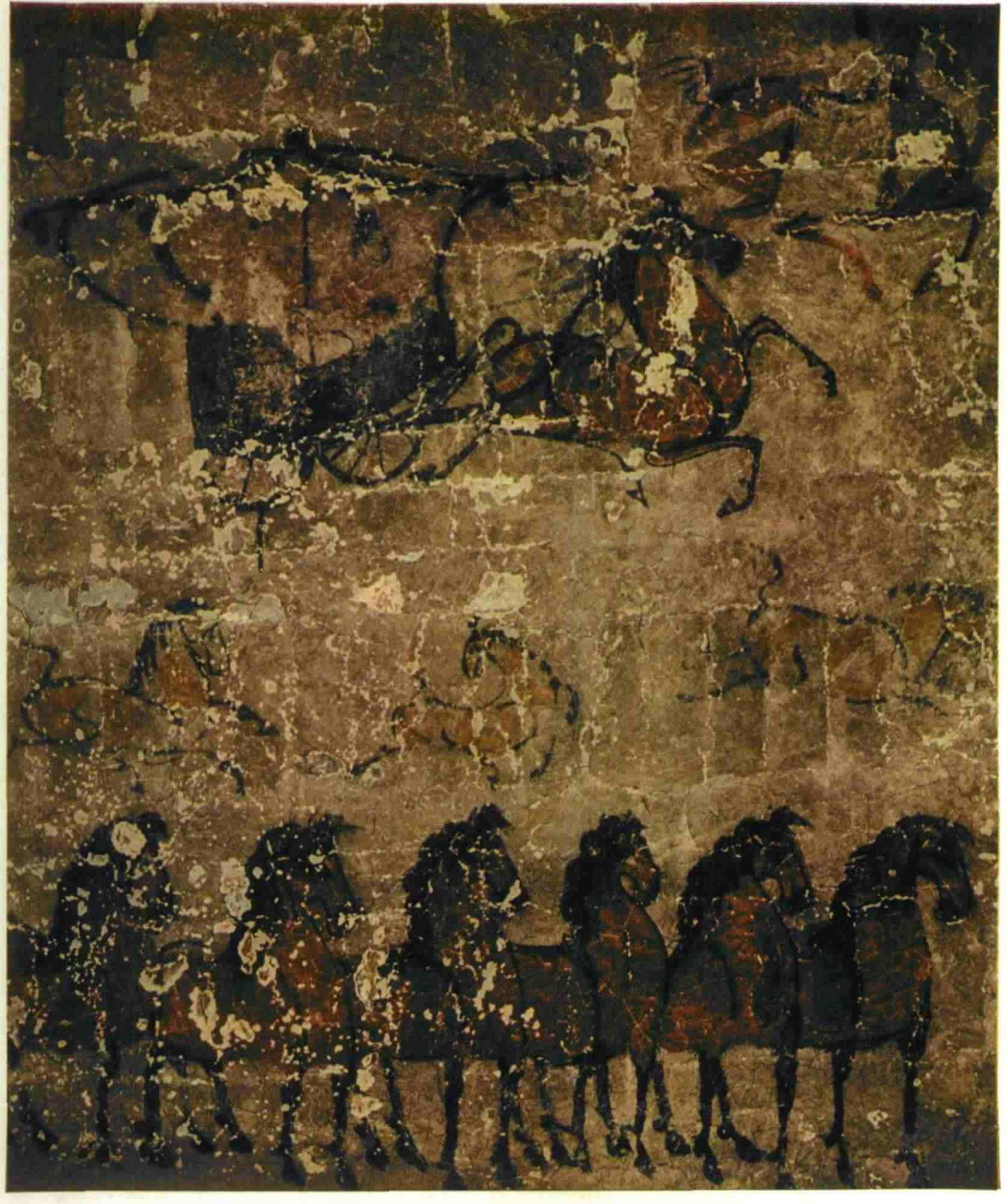 壁畫分上、中、下3層:中層畫墓主人生前的官宦事跡,下層畫他的下屬官曹,頂郁畫靈異等神話傳說。