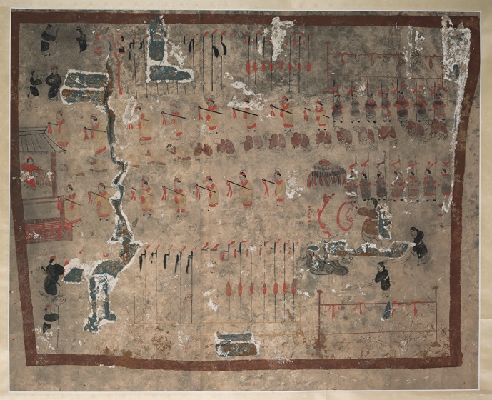 再繞回前室中層,橫跨東北西3面墓壁即是《護(hù)烏桓校尉出行圖》。墓主人所乘軺車,駕3匹黑馬,榜題“使持節(jié)護(hù)烏桓校尉”等字,主車前后有鼓車、斧車,層層環(huán)護(hù)眾多武官、兵丁,隨從有“別駕從事”“功曹從事”“校尉行部”等下屬官職,連車列騎,旗旌飄揚(yáng),場面極為壯觀。中室東壁下半部描繪的是《寧城圖》與《護(hù)烏桓校尉幕府圖》。《寧城圖》畫有城垣、城門、衙署等內(nèi)容,其中寧城南門外武士持戟列隊、身著胡服的少數(shù)民族人物徐徐入內(nèi)的場景最為突出。占據(jù)主畫面的是《護(hù)烏桓校尉幕府圖》,由于任護(hù)烏桓校尉官職是墓主人一生中最值得炫耀的經(jīng)歷,所以,此圖描繪得最為詳細(xì)夸張,是整個壁畫中的核心部分。整個幕府分為堂院、營舍和庖舍3個部分,堂屋為高大的廡殿式房屋,墓主人端坐堂上,堂下藝人在表演樂舞雜耍,少數(shù)民族人物伏拜覲見,周圍環(huán)立官吏武士,場面喧囂隆重。營舍位于幕府后院,是幕府中管理軍務(wù)的機(jī)構(gòu)所在,庖舍位于幕府的西南角,掌管幕府廚飲之事。