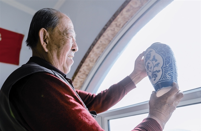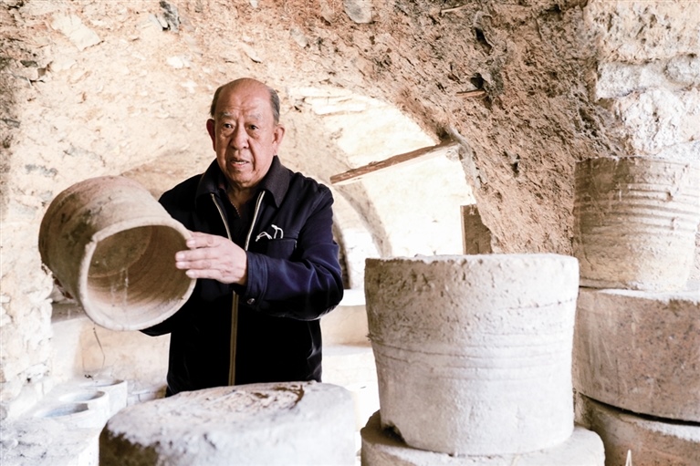 隨后,他走進“饅頭窯”旁邊的一口窯洞,這是當時張家的一間手工作坊,揉泥、拉坯、上釉等一系列制作陶瓷的工序都是在這里完成。“我就出生在這個村子,已經(jīng)是張家瓷藝的第九代傳人了。作為中國磁州窯譜系,清水河黑礬溝瓷藝生產(chǎn)歷史至少已有800年?!标P于這項非遺的歷史故事,張選老人向記者娓娓道來:大約400年前,他們張家走西口從山西來到清水河謀生,當時清水河黑礬溝有一家姓杜的人家做陶瓷營生,張家的先人在杜家打工,大概這樣打工做了三輩人吧,杜家忽然不做了,搬離了黑礬溝,他們張家便把杜家的產(chǎn)業(yè)買了下來繼續(xù)做?!澳莻€時候黑礬溝生產(chǎn)的瓷器都與人們生活息息相關,比如腌菜缸、水甕、碗盤等,一個家庭手工作坊一天能生產(chǎn)500個碗呢,生意很好,人們靠做這個營生也過上了不錯的生活?!睆堖x回憶著清水河瓷藝鼎盛時期的場景。上個世紀70年代,由于交通、技術等原因,黑礬溝燃燒了幾百年的窯火熄滅,傳統(tǒng)“饅頭窯”被正式廢棄,轉(zhuǎn)移到窯溝鄉(xiāng)后手工作坊變成了機械化生產(chǎn),這也讓清水河的陶瓷名聲大噪。當時,在窯溝鄉(xiāng)一帶,從事陶瓷生產(chǎn)的有近萬人,陶瓷業(yè)成為清水河支柱產(chǎn)業(yè)。