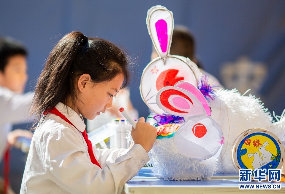 9月7日,呼和浩特市玉泉區(qū)恒昌店巷小學學生在繪制玉兔花燈。新華網(wǎng)發(fā)(丁根厚攝)