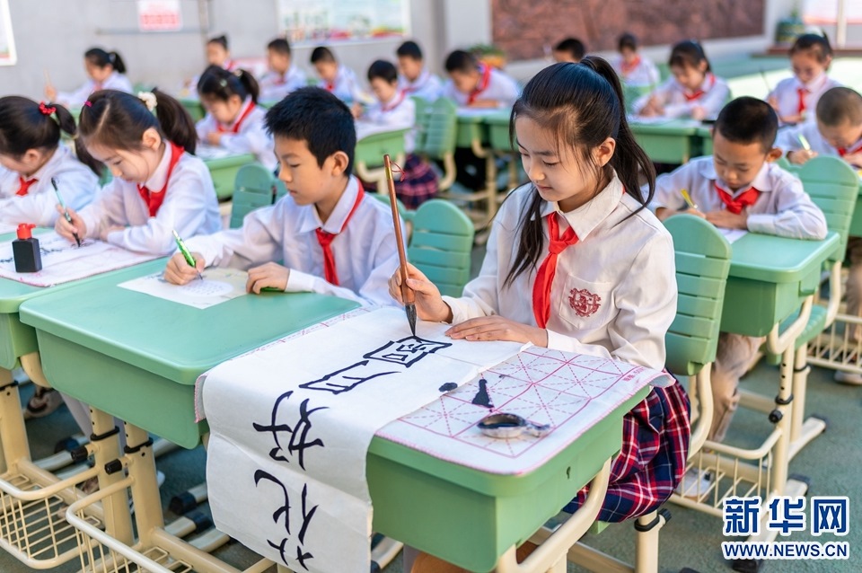 9月7日,呼和浩特市玉泉區(qū)恒昌店巷小學學生在書寫中秋詩詞佳句。新華網(wǎng)發(fā)(丁根厚攝)