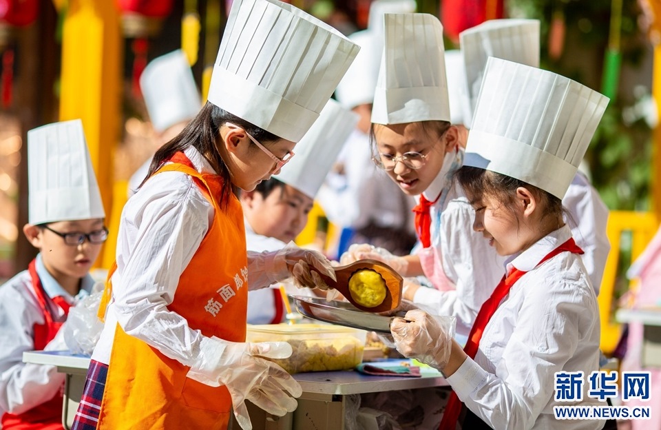 9月7日,呼和浩特市玉泉區(qū)恒昌店巷小學學生在學習做月餅。新華網(wǎng)發(fā)(丁根厚攝)