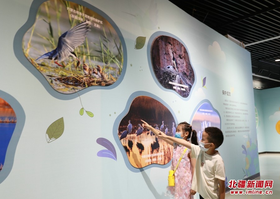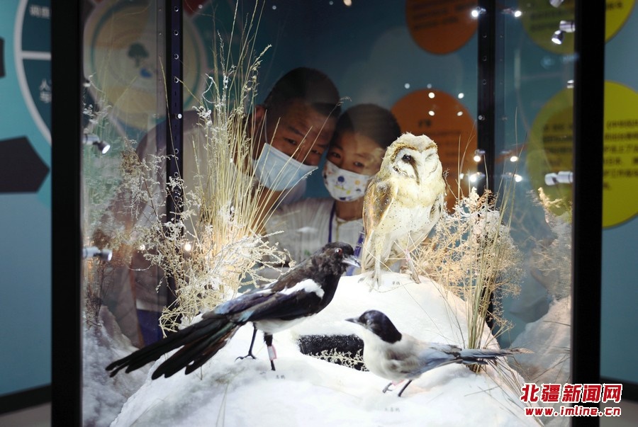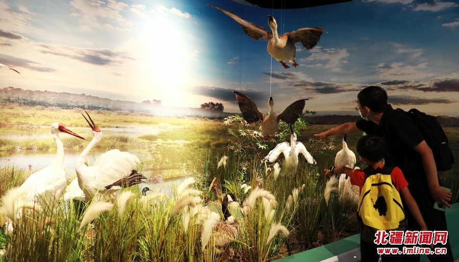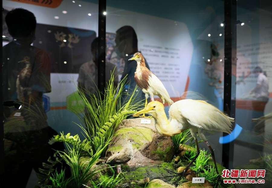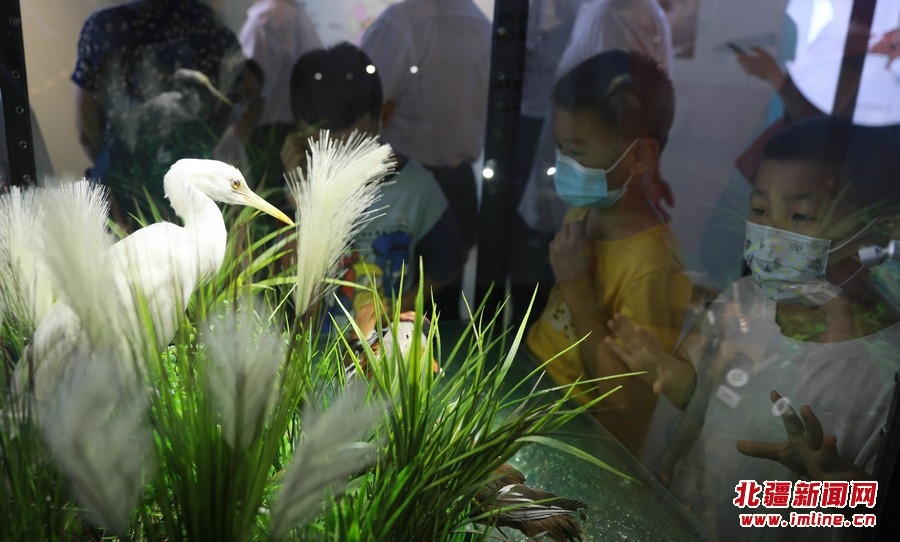 8月13日,參觀者在《振翅北疆》內(nèi)蒙古鳥(niǎo)類特展觀展