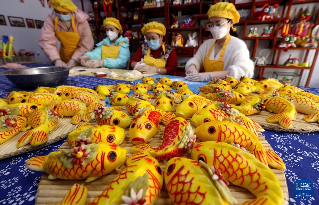 1月13日,山東省棗莊市龍山路街道居民在展示制作的傳統(tǒng)“面魚”。新華社發(fā)(孫中喆 攝)