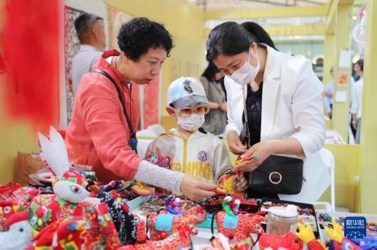 6月10日,在哈爾濱市索菲亞廣場(chǎng)非遺工坊展,市民在了解傳統(tǒng)手工布藝展品。