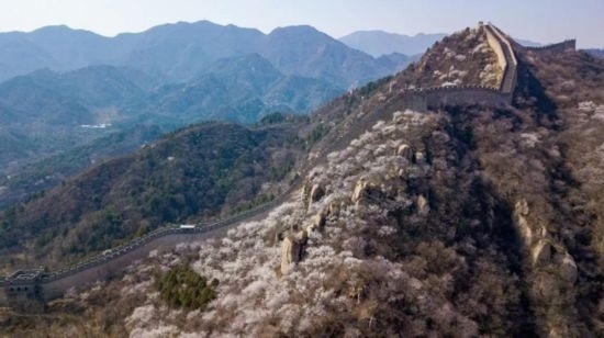 仲春時節(jié),八達(dá)嶺東段的水關(guān)長城山花爛漫,自然與人文景觀交相輝映。(新華社發(fā)陳鐘昊 攝)