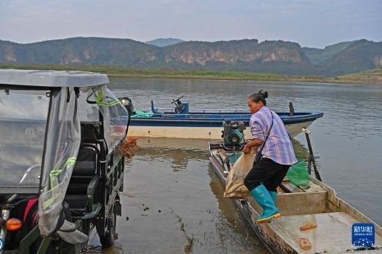運(yùn)江古鎮(zhèn)的居民從船上搬運(yùn)魚(yú)貨(10月11日攝)。