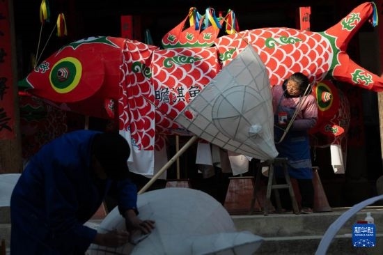 1月6日,在安徽省黃山市歙縣北岸鎮(zhèn)瞻淇村一處?kù)籼美?,村民在制作魚(yú)燈。