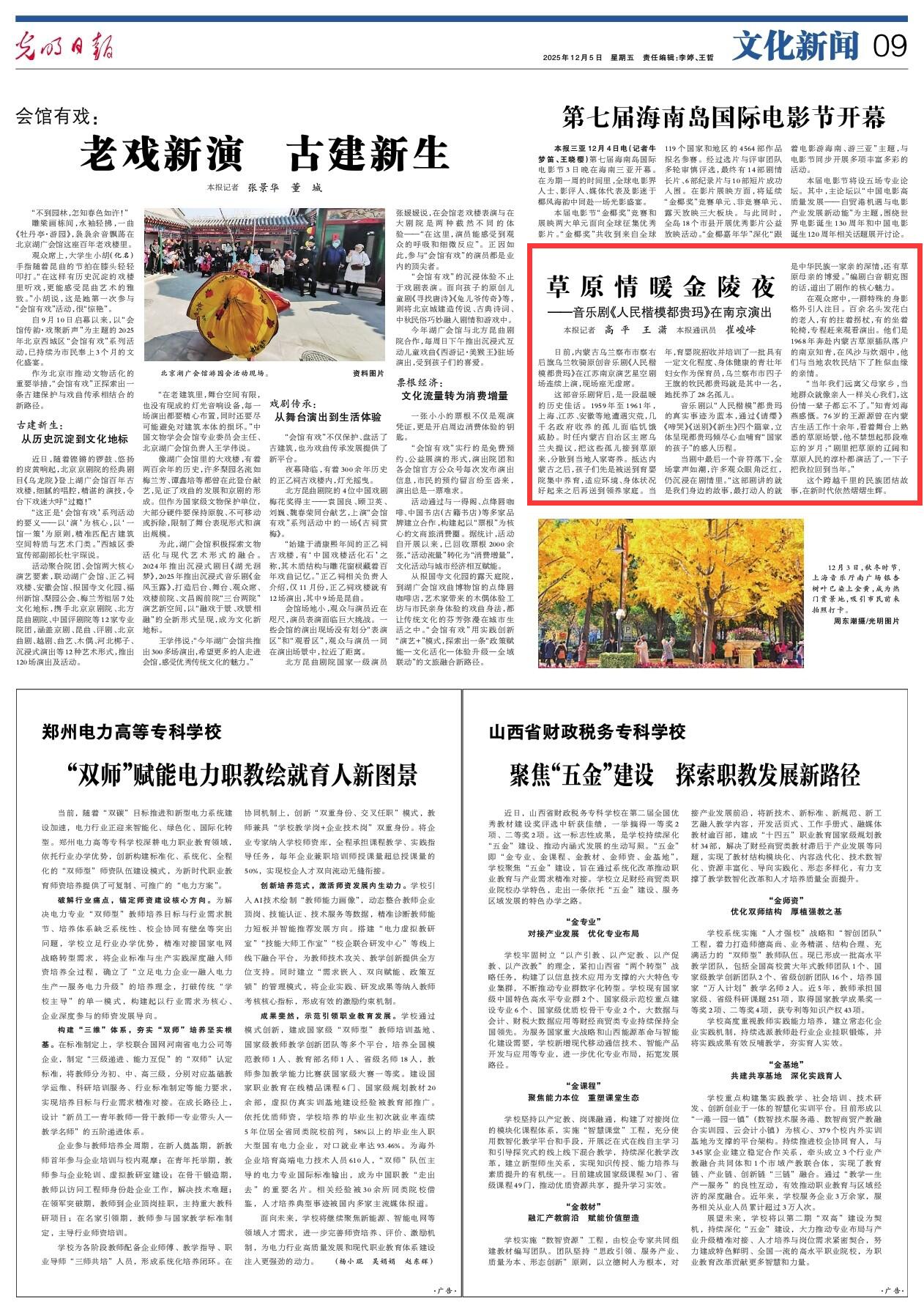 2025年12月5日《光明日?qǐng)?bào)》第9版刊發(fā)了《原情暖金陵夜——音樂劇《人民楷模都貴瑪》在南京演出》的文章,報(bào)道了日前,內(nèi)蒙古烏蘭察布市察右后旗烏蘭牧騎原創(chuàng)音樂劇《人民楷模都貴瑪》在江蘇南京演藝星空劇場(chǎng)連續(xù)上演,現(xiàn)場(chǎng)座無虛席。這個(gè)跨越千里的民族團(tuán)結(jié)故事,在新時(shí)代依然熠熠生輝。