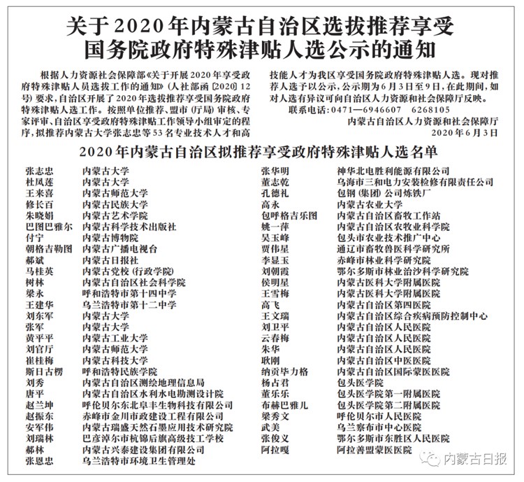 根據(jù)人力資源社會(huì)保障部《關(guān)于開展2020年享受政府特殊津貼人員選拔工作的通知》(人社部函〔2020〕12號(hào))要求,自治區(qū)開展了2020年選拔推薦享受國(guó)務(wù)院政府特殊津貼人選工作。按照單位推薦、盟市(廳局)審核、專家評(píng)審、自治區(qū)享受政府特殊津貼工作領(lǐng)導(dǎo)小組審定的程序,擬推薦內(nèi)蒙古大學(xué)張志忠等53名專業(yè)技術(shù)人才和高技能人才為我區(qū)享受國(guó)務(wù)院政府特殊津貼人選。現(xiàn)對(duì)推薦人選予以公示,公示期為6月3日至9日,在此期間,如對(duì)人選有異議可向自治區(qū)人力資源和社會(huì)保障廳反映。