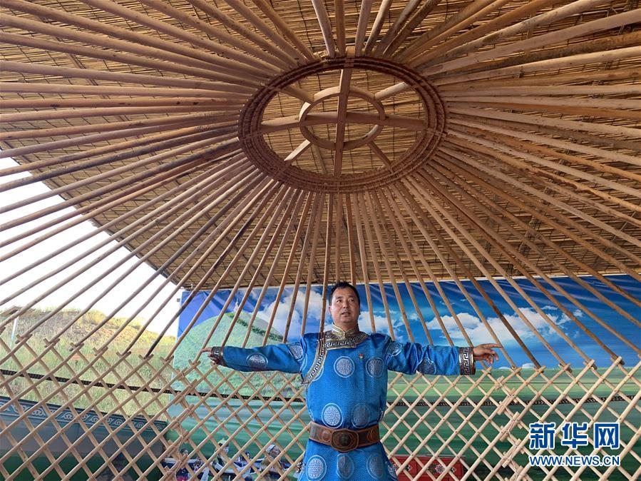 7月17日,布仁巴雅爾在展示蒙古包制作過程中搭設(shè)完成的頂桿。新華社記者 王靖 攝