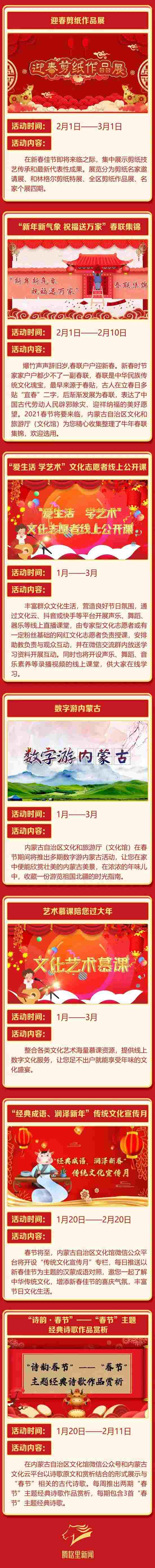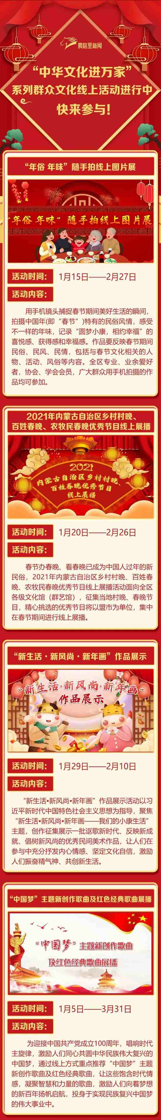 2021年春節(jié)的腳步越來越近,為豐富春節(jié)期間廣大群眾的精神文化生活,營造歡樂、團(tuán)圓、喜慶、祥和的節(jié)日氛圍,內(nèi)蒙古自治區(qū)文化和旅游廳(文化館)于2021年1月至3月將推出“中華文化進(jìn)萬家”系列群眾文化線上活動。