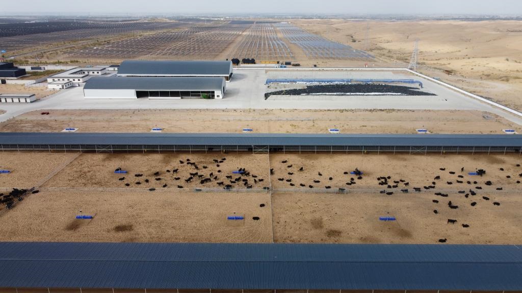 “這是我們在光伏基地打造的循環(huán)經(jīng)濟(jì)項(xiàng)目?!敝行罂萍加邢薰救馀?biāo)準(zhǔn)化養(yǎng)殖場負(fù)責(zé)人石龍說,養(yǎng)殖場肉牛產(chǎn)生的糞便可以作為光伏基地板間種植作物的肥料,改善沙地土質(zhì)的同時還能促進(jìn)作物生長,而這些作物又能作為飼料供應(yīng)養(yǎng)殖場,循環(huán)發(fā)展的同時還能促進(jìn)沙漠生態(tài)改善。