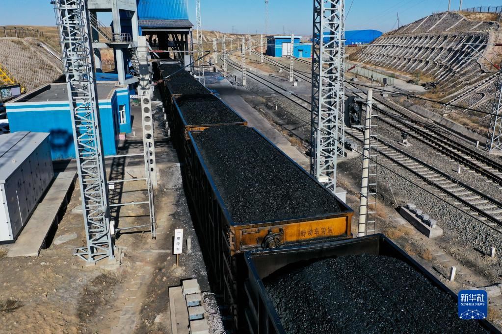 這是11月23日在位于鄂爾多斯市的淮河能源西部煤電集團(tuán)色連二礦罕臺川集裝站拍攝的正在裝煤的列車(無人機照片)。新華社記者李志鵬攝