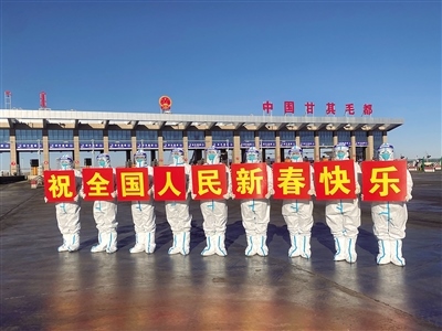 1月31日,民警在甘其毛都口岸貨運(yùn)通道祝全國人民新春快樂。春節(jié)期間,內(nèi)蒙古甘其毛都出入境邊防檢查站民警堅(jiān)守一線,為出入境車輛提供優(yōu)質(zhì)高效的通關(guān)服務(wù),守護(hù)萬家燈火。(記者 孟和朝魯 通訊員 宋緒明 攝)
