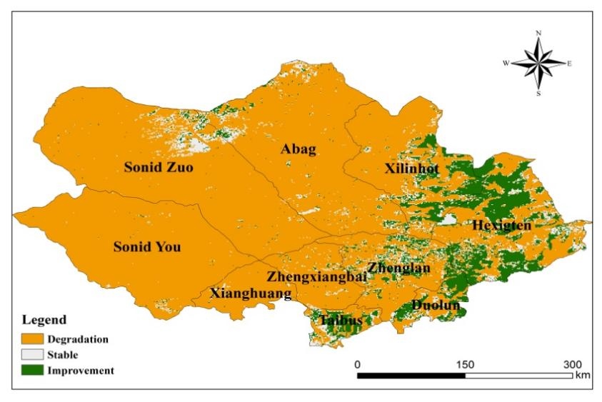 隨著國家生態(tài)恢復(fù)工程的啟動(dòng),渾善達(dá)克沙地未出現(xiàn)新的生態(tài)質(zhì)量退化區(qū)域,目前生態(tài)系統(tǒng)質(zhì)量提高區(qū)域占沙地五分之一,主要分布在東部。