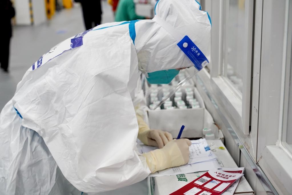 4月30日,上海臨港方艙醫(yī)院的醫(yī)護(hù)人員在整理感染者信息。新華社記者楊有宗 攝