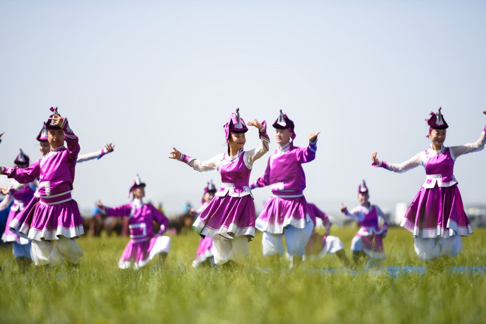 表演者在錫林浩特市游牧文化節(jié)·白音錫勒牧場(chǎng)建場(chǎng)70周年那達(dá)慕開(kāi)幕式上表演傳統(tǒng)舞蹈(2020年8月2日攝)。新華社記者彭源攝