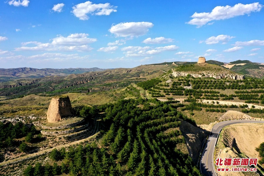 端午時節(jié),由G209國道岔口至老牛坡的公路正在緊張建設(shè)中。汽車沿著剛剛鋪好軟基的砂石路面行進,車窗外,高高低低的烽火墩臺聳立在山巒之上,巍峨雄偉,座座墩臺直沖云霄,蔚為壯觀。清水河縣明長城國家文化公園的核心區(qū)小元峁段長城(栜木塔長城)即位于此。
