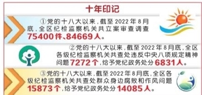 數(shù)據(jù)顯示,黨的十八大以來,截至2022年8月底,全區(qū)紀檢監(jiān)察機關(guān)立案審查調(diào)查75400件、84669人,做到有腐必反、除惡務(wù)盡,推動政治生態(tài)持續(xù)向上向好。
