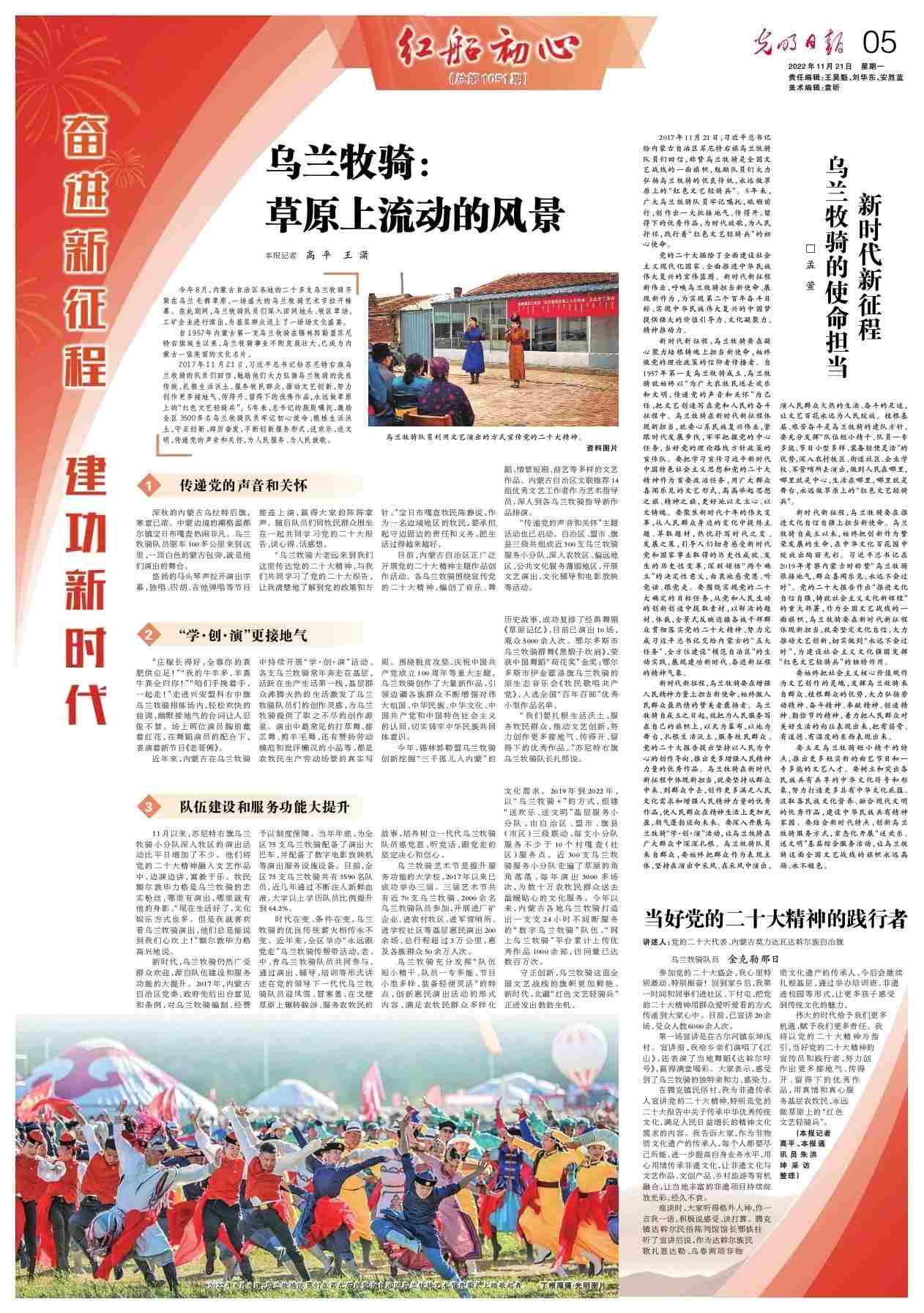 2017年11月21日,習(xí)近平總書記給蘇尼特右旗烏蘭牧騎的隊(duì)員們回信,勉勵(lì)他們大力弘揚(yáng)烏蘭牧騎的優(yōu)良傳統(tǒng),扎根生活沃土,服務(wù)牧民群眾,推動(dòng)文藝創(chuàng)新,努力創(chuàng)作更多接地氣、傳得開、留得下的優(yōu)秀作品,永遠(yuǎn)做草原上的“紅色文藝輕騎兵”。5年來(lái),總書記的殷殷囑托,激勵(lì)全區(qū)3500多名烏蘭牧騎隊(duì)員牢記初心使命、根植生活沃土,守正創(chuàng)新、踔厲奮發(fā),不斷創(chuàng)新服務(wù)形式,送歡樂、送文明,傳遞黨的聲音和關(guān)懷,為人民服務(wù)、為人民放歌。