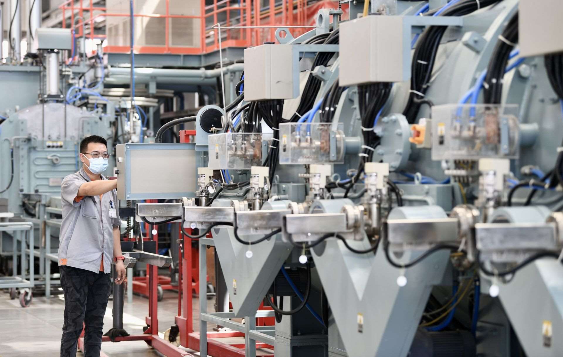 在包頭市稀土高新區(qū)大地熊(包頭)永磁科技有限公司生產(chǎn)車間內(nèi),技術(shù)人員查看設備運行情況。