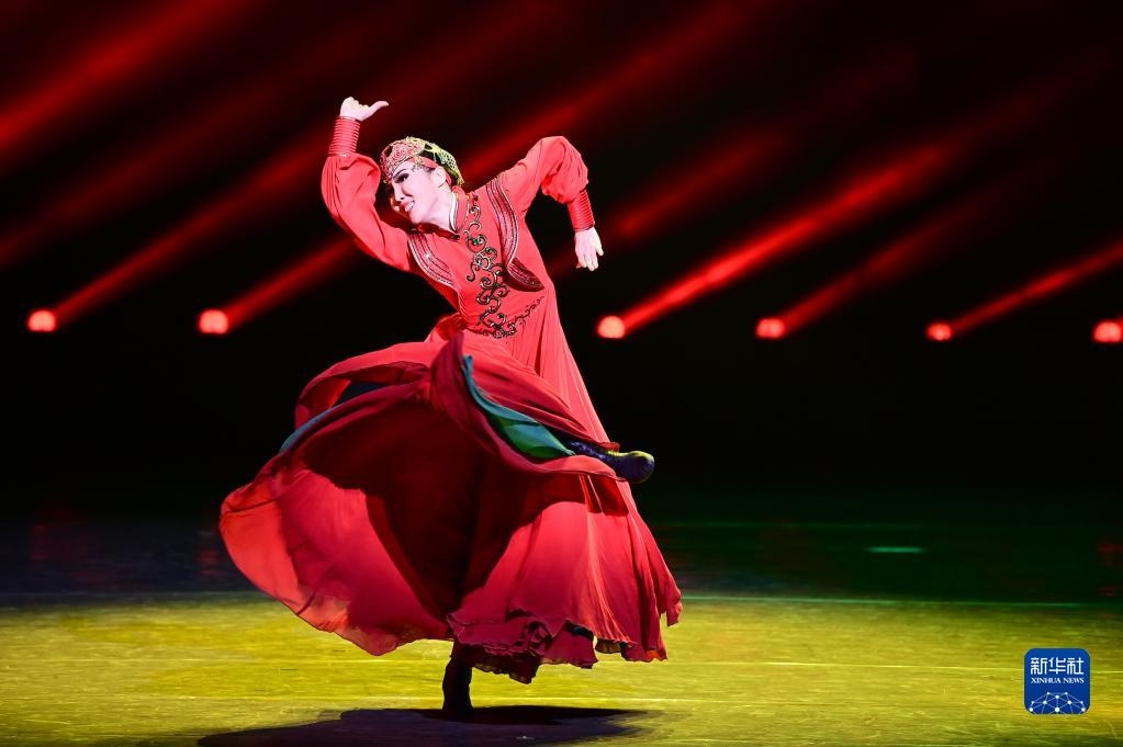 3月27日,內蒙古自治區(qū)直屬烏蘭牧騎參賽演員表演群舞《風之馬》。新華社發(fā)(王正攝)