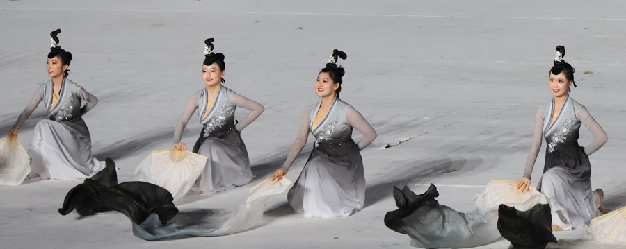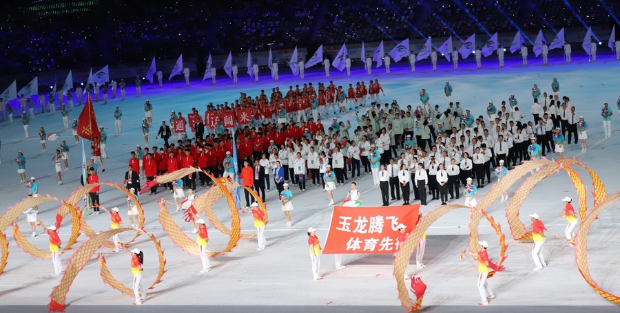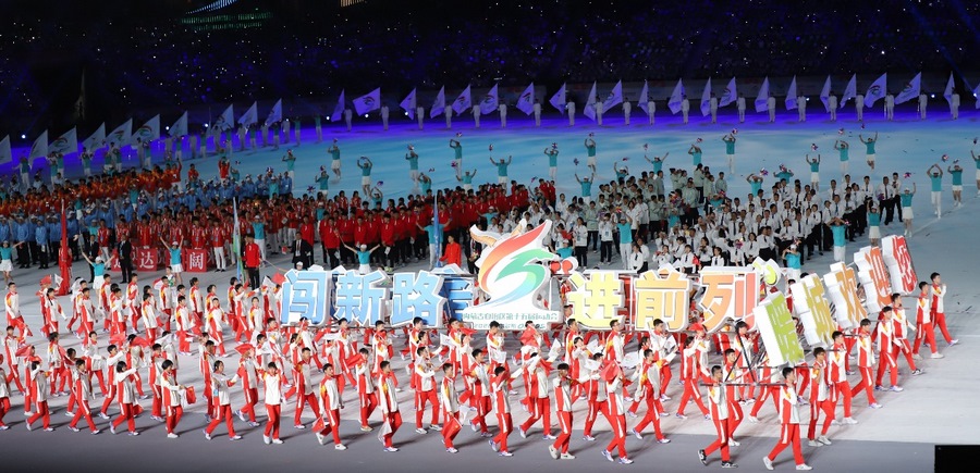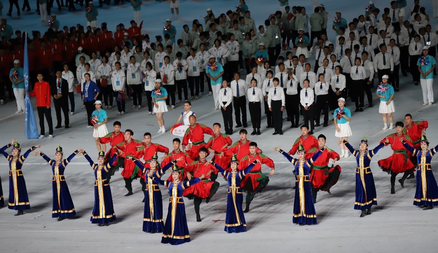 入場(chǎng)儀式結(jié)束后,在雄壯的國(guó)歌聲中,鮮艷的五星紅旗冉冉升起,在體育中心上空迎風(fēng)飄揚(yáng)。期盼的眼神,真摯的祝福,蕩漾在每個(gè)人的心間。開幕式文體展演隨后正式拉開帷幕。