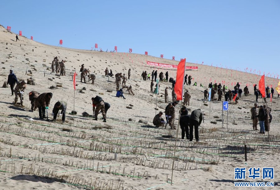 ??參會人員與專業(yè)技術(shù)服務(wù)隊以及社會各界代表,在渾善達(dá)克沙地設(shè)置沙障。新華網(wǎng) 石毅攝