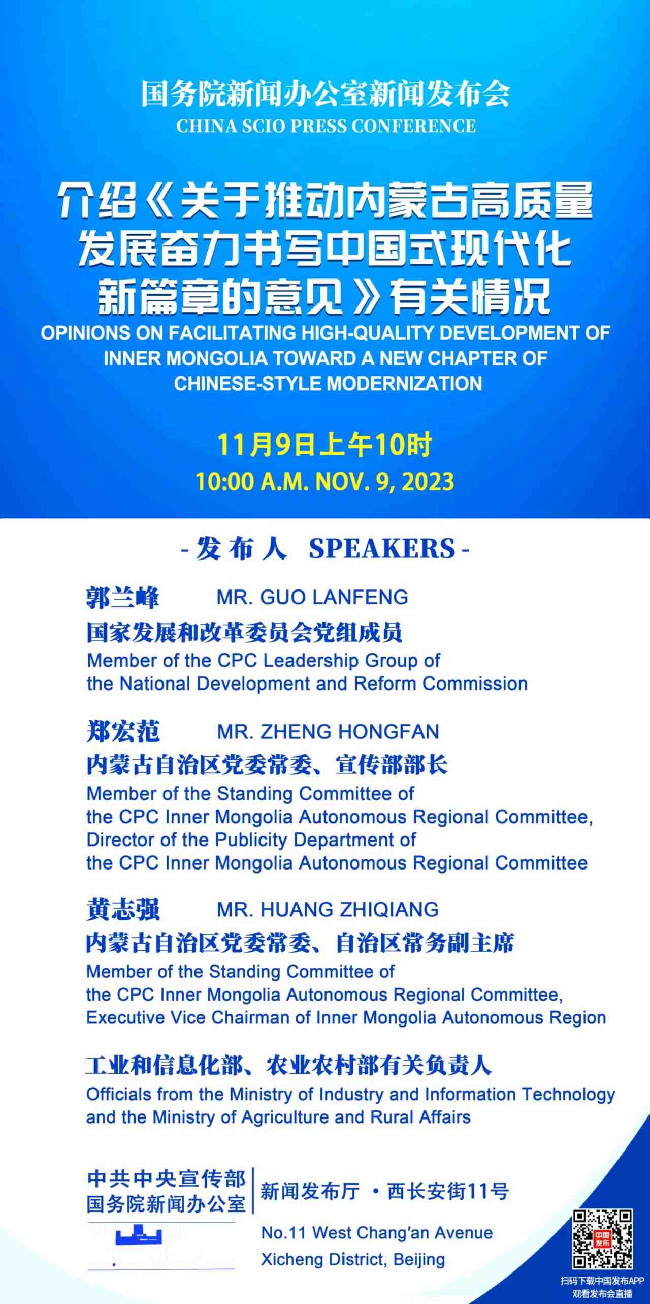 2023年11月9日(星期四)上午10時,國務(wù)院新聞辦公室舉行新聞發(fā)布會,請國家發(fā)展和改革委員會黨組成員郭蘭峰,內(nèi)蒙古自治區(qū)黨委常委、宣傳部部長鄭宏范,內(nèi)蒙古自治區(qū)黨委常委、自治區(qū)常務(wù)副主席黃志強和工業(yè)和信息化部、農(nóng)業(yè)農(nóng)村部有關(guān)負責(zé)人介紹《關(guān)于推動內(nèi)蒙古高質(zhì)量發(fā)展奮力書寫中國式現(xiàn)代化新篇章的意見》有關(guān)情況,并答記者問。