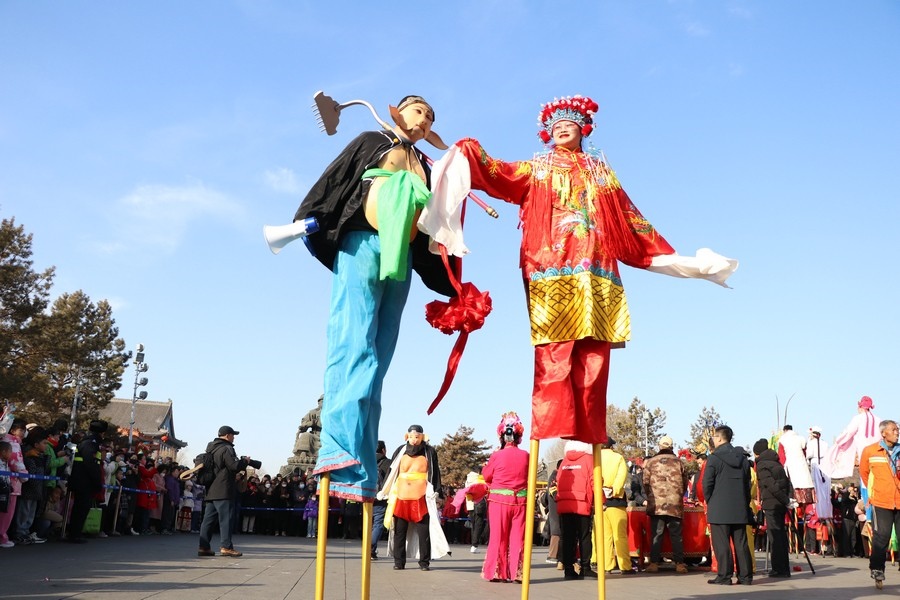 現(xiàn)場(chǎng)人潮涌動(dòng),歡聲笑語此起彼伏。扭秧歌隊(duì)伍身著色彩斑斕的服裝,手持彩扇,隨著歡快的音樂節(jié)奏,邁出輕盈的步伐,每一個(gè)動(dòng)作都充滿了力量感和韻律感。他們的表情歡快,笑容燦爛,將歡樂傳遞給每一位觀眾。與此同時(shí),踩高蹺也吸引了眾多觀眾的目光。演員們踩著高高的木蹺,身著華麗的戲服,扮演著各種角色,自如地行走、跳躍,引得觀眾陣陣喝彩。