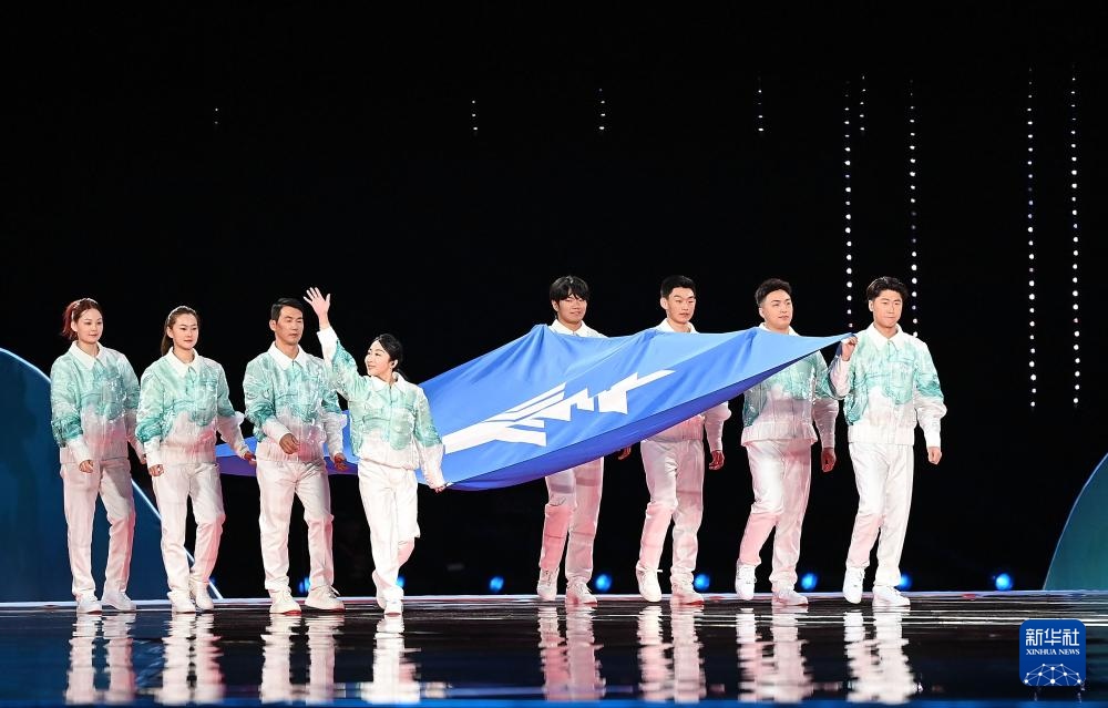 ??2月17日,中華人民共和國第十四屆冬季運(yùn)動(dòng)會會旗在開幕式上入場。新華社記者 楊晨光 攝
